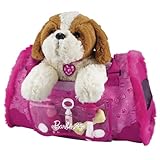 Hug 'n Heal Pet Doctor plush puppy responds to touch with barks, whimpers, and other noises. View larger. | Pet Care in a Loving Home Pet care comes to life with the Barbie Hug 'n Heal Pet Doctor. The plush puppy's interactive responses to touch and the feeding accessories enhance the experience of pretend vet care for your young animal lover. The adorable plush puppy included in the Barbie Hug 'n Heal features interactive areas that respond to touch on the back, front paws, and head with noises that include barks, whimpers, growls, and panting. The bone and feeding bottle trigger feeding noises when held up to the plush pup's mouth. Everything included in the Hug 'n Heal Pet Doctor kit fits neatly inside a brightly colored soft dog carrier bag. This stylish bag features a top panel with zipper closures, a mesh side window, and a clear plastic side pouch with Velcro closures. Brightly colored plastic accessories that encourage nurturing for the responsive pup include a stethoscope, thermometer, syringe, feeding bottle, and bone. A prescription pad and health certificate help to stimulate the imagination and inspire fun, creative play. Audible Responses to Tender Loving Care Realistic audible responses to touch and feeding help the Barbie Hug 'n Heal Pet Doctor bring imagination to life. The front paws of the adorable plush puppy are set to respond audibly to touch with whimpers and growls. Similar touch points on the head and back trigger barking and panting noises. The puppy also responds to holding the bone and feeding bottle up to its mouth by emitting sounds of feeding and chewing. The electronic puppy is powered by three AAA batteries (included) that must be installed by an adult using a Phillips screwdriver. A switch on the power supply box located in the stomach of the puppy can be moved from "demo" to "on," or to "off" if the puppy will be out of use for extended periods of time. What's in the Box Plush puppy with power pack, three AAA batteries, plastic stethoscope, plastic thermometer, plastic syringe, plastic bone, plastic feeding bottle, prescription tablet, health certificate, soft carrier bag, and operating instructions.